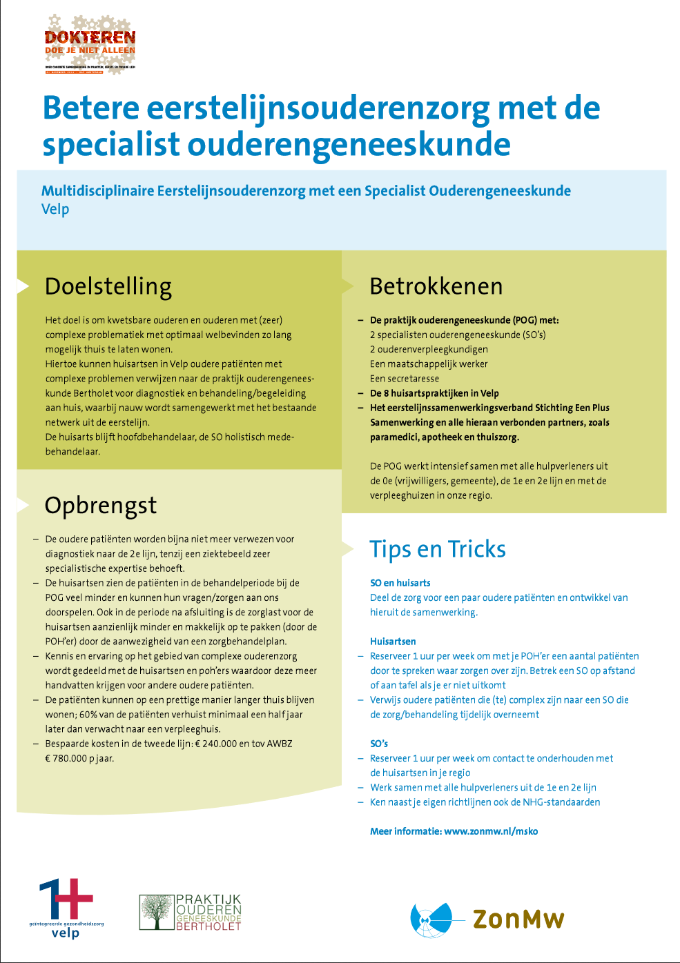 Uitgebreide informatie over dit project vindt u in het artikel 'Kernelementen en resultaten van Multidisciplinaire Eerstelijnsouderenzorg met een Specialist Ouderengeneeskunde in Velp' in het tijdschrift Bijblijven 'Op 1 lijn: samenwerking in de eerste lijn' (nummer 10, december 2015). Het tijdschrift Bijblijven is een praktisch nascholingstijdschrift voor de huisarts dat wordt uitgegeven door Bohn Stafleu van Loghum in Houten.
